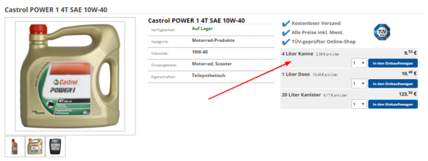 Jetzt aber schnell! Bei Reifendirekt scheint sich gerade ein Preisfehler eingeschlichen zu haben, ihr bekommt 4 Liter Castrol Power 1 4T 10W-40 für 9,53€ (Vergleichspreis ~27€) Ersparnis ~17€