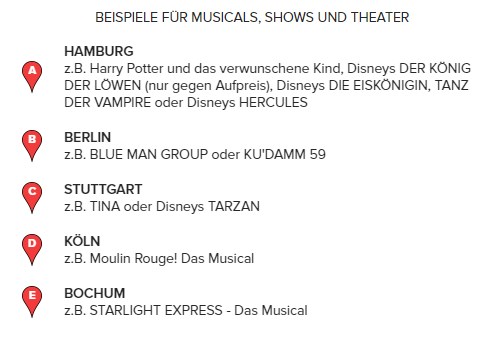 Euch stehen hier verschiedene Musicals zur Auswahl z.B. Tarzan, Starlight Express, König der Löwen uvm.