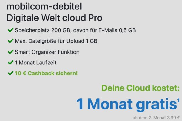 Gültig für md cloud Pro. Mindestlaufzeit 1 Monat, bei Nichtkündigung verlängert sich die Option automatisch um einen weiteren Monat. Voraussetzungen / Bedingungen: Nutzung erfordert eine Registrierung unter www.cloud.md.de. Die E-Mail Adresse dient als Zugang für Ihr Postfach und Ihren Online-Speicher; Inhalte sind mit der Löschung unwiderruflich verloren, sicheres SSL-Login. Speicherdauern in den einzelnen Ordnern: „Posteingang“ und „Gesendet“ 90 Tage; „Spam- und Virenverdacht“ 3 Tage; „Papierkorb“ 1 Tag, E-Mails in den eigenen Ordnern werden unbegrenzt aufbewahrt. Wird das Postfach 180 Tage nicht genutzt, wird der Inhalt automatisch gelöscht. Sonstiges: Das Produkt hat eine Mindestlaufzeit von 1 Monat bei einer mtl. Grundgebühr von 3,99 Euro (im 1. Monat kostenfrei und jederzeit zum Ende des Sonderkündigungsrechts kündbar). Bei nicht fristgerechter Kündigung verlängert sich die Laufzeit des Produktes um 1 Monat. Die Kündigungsfrist beträgt 14 Tage zum Monatsende. Mit Beendigung des Vertrages werden sämtliche Inhalte der cloud unwiderruflich gelöscht und können nicht wiederhergestellt werden. Es gelten zudem die Allgemeinen Geschäftsbedingungen für mobilcom-debitel Digital Lifestyle Produkte; bei Abweichungen sind diese Produktinformationen vorrangig. Zusätzlich wird ein Cashback in Höhe von 10€ binnen 14 Tage nach erstmaliger Freischaltung auf das Girokonto des Antragstellers überwiesen. Dieser Tarif ist von der "Kunde-wirbt-Kunde"-Aktion ausgeschlossen.