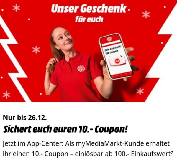 Bis zum 26.12.2025 gibt es bei MediaMarkt für alle die in der App etwas bestellen wollen, einen 10€ Gutschein (MBW 100€).