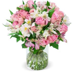 Du suchst einen Blumenstrauß, der einer beschenkten Person eine ganz besonders freudige Überraschung bietet? Dann halte dich fest! Denn dieser geniale “Sweet Surprise” erblüht mit bis zu 60 Blüten und legt einen zarten rosafarbenen Schleier über die Welt. Das großartige Arrangement aus herrlich duftenden pinken Rosen und exotischen weißen Inkalilien ist mit seiner wunderschönen Gestaltung das perfekte Geschenk in einer jungen Beziehung oder für ein ganz besonderes Dankeschön und garantiert eine echte “Süße Überraschung”.