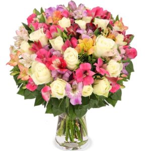 Wenn du noch auf der Suche nach deinem großartigen Strauß als Blumengeschenk oder Dekoration bist, dann können wir dir mit unserem Blumenstrauß “White Dream” jetzt ein geniales Arrangement präsentieren. Mit seiner himmlisch weißen Pracht wird immer für ein ganz besonderes Erlebnis gesorgt. Seine blütenreiche Kombination kreiert einen ganz besonders traumhaften Strauß, welcher optisch alle Blicke auf sich zu ziehen weiß. Edle weiße Rosen begeistern mit ihren beliebten und charakterstarken Blütenköpfen genauso wie auch die exotischen Alstroemeria mit ihren einzigartig gestrichelten und gepunkteten Kronblättern. Die strahlend weiße Farbe wird den Empfänger der Blumen dabei nicht nur in traumhafte Gefilde entführen, sondern auch mit dem großartigen Blumenduft als auch der positiven und anmutigen Symbolik dafür sorgen, dass er gar nicht mehr aufwachen möchte. Also verzaubere auch du mit unserem “weißen Traum” deine liebsten Menschen!