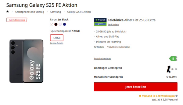 Im Onlineshop von MediaMarkt könnt ihr euch das Samsung Galaxy S25 FE + 25GB 5G + Alles-Flat im o2-Netz für 17,99€/Monat sichern.
