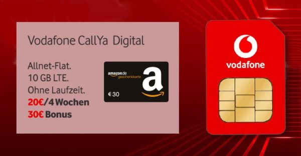 - 30€ Gutschein für monatlich kündbare 10GB LTE Allnet-Flat (VF-CallYa) für 20€ – 10€ Gewinn machen, garantiert