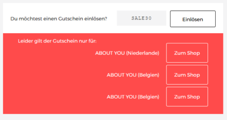 Diese Aktion läuft bis zum 11.08.2019 (23:59 Uhr). Im Aktionszeitraum gewähren wir, mit dem Gutscheincode SALE30, 30% Extra-Rabatt auf bereits reduzierte Ware. Einzelne Artikel können von der Aktion ausgeschlossen sein. Es gilt ein Mindestbestellwert von 75€/CHF. Der Gutschein ist nicht übertragbar und kann nur in Kombination mit einer Bestellung bei ABOUT YOU eingelöst werden. Der Gutschein wird automatisch, bei Angabe des Gutschein-Codes vor Bestellabschluss, von der Rechnung abgezogen. Im Falle einer vollständigen Retoure verfällt der Gutscheinwert. Bei einer teilweisen Retoure erfolgt eine Anrechnung des Gutscheins nur, wenn der Mindestbestellwert bei den behaltenen Artikeln erreicht wird. Der Gutschein gilt nicht in Verbindung mit anderen Rabatten. Bei Verlust oder Diebstahl des Gutscheins kann keine Erstattung durch die ABOUT YOU GmbH erfolgen. Ansprüche auf anteiligen oder vollständigen Ersatz eines Gutscheins bestehen nicht.