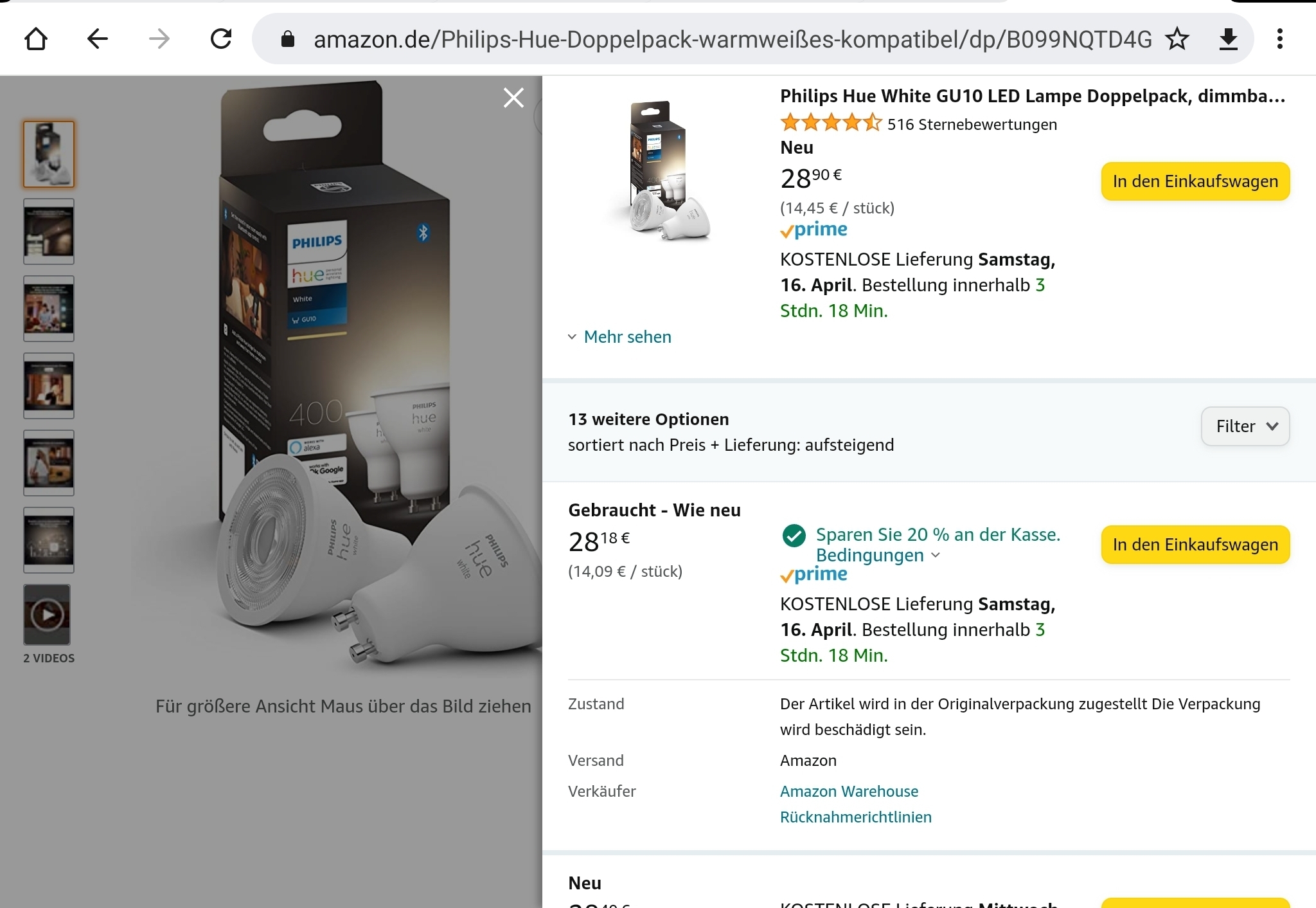dasSams 13.04.2022, 20:43 #Philips Hue White GU10 LED Lampe Doppelpack, dimmbar, gefunden 2 Stück für 22.54€