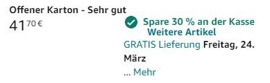 Nur von 12. Juni 2023, um 00.00 Uhr bis 2. Juli 2023, um 23.59 Uhr erhalten Amazon Kunden 30% Rabatt auf ausgewählte Produkte von Amazon Retourenkauf. Die 30% Rabatt werden automatisch an der Kasse abgezogen. Alle teilnehmenden Produkte findest du in diesem Shop. Gilt nicht in Kombination mit anderen Aktionen.
