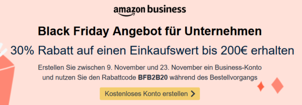 Ihr habt ein Gewerbe und kauft gern das ein oder andere bei Amazon ein? Dann könnt ihr euer Privatkonto ganz einfach in ein Business-Konto umwandeln und für kurze Zeit bekommt ihr von Amazon einen 30% Gutschein mit dem ihr dann bis zu 60€ sparen könnt. Benutzt dazu einfach den Gutscheincode: BFB2B20