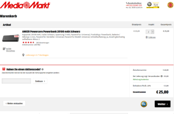 Bei MediaMarkt bekommt ihr aktuell eine ANKER Powercore Akkubank mit 20.100 mAh zum Preis von 25€ (Vergleichspreis: ~33€) Ersparnis ~7€