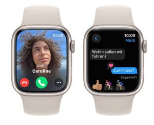 - Sende unterwegs eine Textnachricht, mach einen Anruf, hör Musik und Podcasts, verwende Siri und erhalte Mitteilungen. Die Apple Watch Series 9 (GPS) funktioniert mit deinem iPhone und im WLAN, damit du in Verbindung bleibst.
