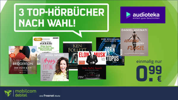 Denn über mobilcom-debitel bekommt man 3 Monate Audioteka Clubmitgliedschaft (über 30.000 Hörbücher, Spiegel-Bestsellerlisten, u.v.m.) für 0,99€ (regulärer Preis: ~27€) Ersparnis ~26€