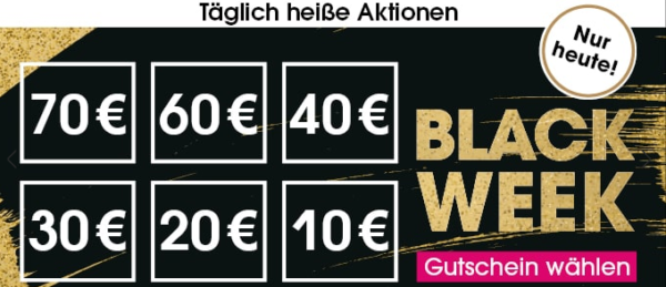 *Der 10€-Aktionsgutschein BLACK12371 gilt ab einem Mindesteinkaufswert nach Retouren von 80€, der 20€-Aktionsgutschein BLACK29807 gilt ab einem Mindesteinkaufswert nach Retouren von 160€, der 30€-Aktionsgutschein BLACK39014 gilt ab einem Mindesteinkaufswert nach Retouren von 240€, der 40€-Aktionsgutschein BLACK42827 gilt ab einem Mindesteinkaufswert nach Retouren von 320€, der 60€-Aktionsgutschein BLACK55988 gilt ab einem Mindesteinkaufswert nach Retouren von 480€ und der 70€-Aktionsgutschein BLACK69507 gilt ab einem Mindesteinkaufswert nach Retouren von 550€. Die Aktionsgutscheine sind nur am 23.11.2020 einmalig einlösbar. Wird der Mindesteinkaufswert nach (Teil-)Warenretouren unterschritten, berechnen wir den ursprünglichen vollen Preis der Waren, die du behältst. Ausgeschlossen sind einzelne Produkte der Kategorie ‚Milchnahrung‘ sowie Geschenkgutscheine, Bücher und Artikel einzelner Hersteller. Barauszahlung oder Kombination mit anderen Rabattaktionen ist nicht möglich. Bei Verwendung des Aktionsgutscheins gelten unsere AGB, hier insbesondere Ziff. 5.