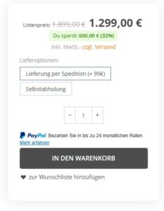 Bei Selbstabholung könnt ihr euch die 99€ Speditionskosten sparen.