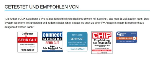 - Erleben Sie geballte Solar-Power mit unserem Premium-Komplettset bestehend aus dem Anker SOLIX Solarbank 3 Pro Stromspeicher und vier leistungsstarken JA Solar 455W Bifacial Solarmodulen. Zusammen ergeben sie eine Gesamtleistung von 1820Wp – ideal für maximale Eigenversorgung mit Sonnenstrom.