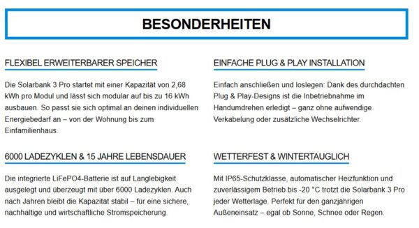 - Die Anker Solarbank 3 Pro bietet eine intelligente Speicherkapazität von 2,68 kWh, die auf bis zu 16 kWh erweiterbar ist. Die Plug & Play-Installation ermöglicht eine schnelle Inbetriebnahme – einfach anschließen und loslegen. Mit 4 unabhängigen MPPTs und einer maximalen PV-Eingangsleistung von 3600 W nutzt die Solarbank jede Kilowattstunde optimal aus.