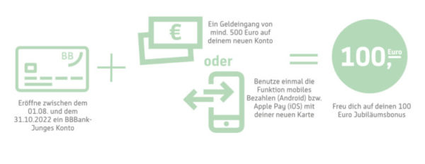 - Eröffnung BBBank-Junges Konto zwischen dem 01.08. und dem 31.10.2022, Neumitglied (keine Mitgliedschaft in den letzten 24 Monaten) ab 18 Jahren bis zur Vollendung des 27. Lebensjahres, Geldeingang i.H.v. 500 Euro oder Bezahlung mit einer unserer Karten über die Funktion mobiles bezahlen (Android) bzw. Apple Pay (iOS) innerhalb von 3 Monaten nach Kontoeröffnung