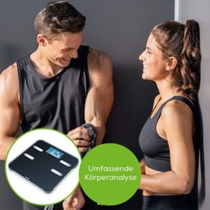 - Die digitale Waage mit großem, blau hinterleuchteten Display misst das Körpergewicht, Körperfett, Körperwasser, die Knochenmasse und den Muskelanteil