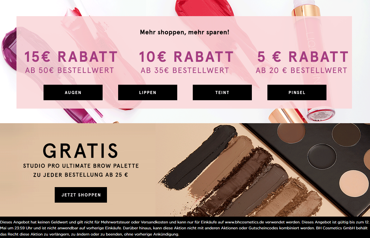 BH-Cosmetics: Staffelrabatt 5/10/15 Euro + Geschenk und kostenlose Lieferung (ab 30€ Bestellwert)