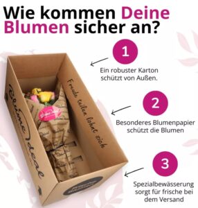 - Extras: Spezieller Blumenversandkarton mit Wasserversorgung durch eine Frischetüte