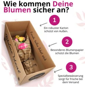 - Extras: Spezieller Blumenversandkarton mit Wasserversorgung durch eine Frischetüte