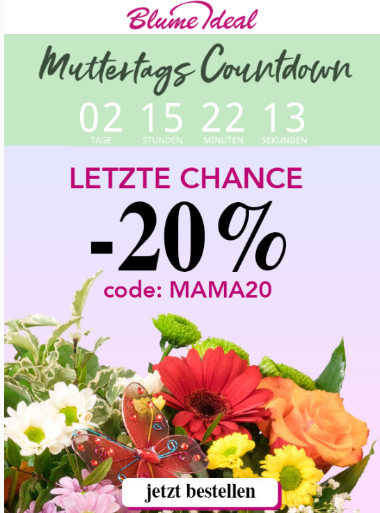 Am 12. Mai ist Muttertag und bei BlumeIdeal bekommt ihr gerade 20% Rabatt auf Blumen zum Muttertag.