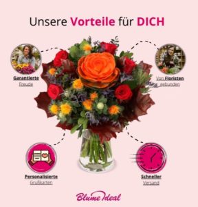Wie immer könnt ihr euch auch bei diesem Angebot, gegen einen kleinen Aufpreis, für eine zusätzliche Grußkarte oder ein kleines Präsent in Form eines Plüschtiers oder Praline entscheiden. Als mögliche Liefertermine stehen euch die Tage ab 27. Oktober zur Verfügung mit Ausnahme von Sonn- & Montagen. 🙂 Na? An wen geht dieses Mal eure kleine Blumenüberraschung? Lasst gerne ein Kommentar dazu da. 😉