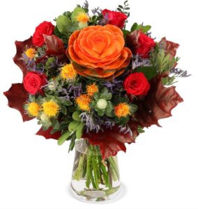 Blumengruß Herbstwiese mit Rosen, Carthamus, Statice, Eichenlaub, Zierkohl für 28,98€