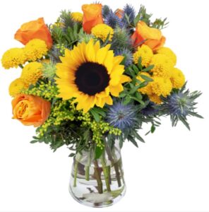 Blumenstrauß Sonnenkuss mit Sonnenblumen, Rosen, Solidago, edelblauen Disteln für 32,48€