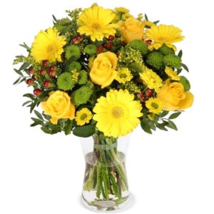 - Inhalt: 18 Stiele (4 Gelbe Rosen, 3 Gelbe Santini, 4 Gelbe Gerbera, 2 Hypericum, 3 Solidago, 2 Pistacia)