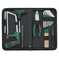 - Lieferumfang: 1x Bügelsäge 150 mm, 1 x Kombinationszange 180 mm, 1 x Bit-Schraubendreher mit T-Griff, 1 x Tieflochmarker, 10 x Sechskantschlüssel (1,5–10 mm), 2 x Bügelsägeblätter 150 mm, 18 x Bit (PH, PZ, SL, TX, HEX), 6 x Mine, mehrfarbig, 1 x Stofftasche mit Reißverschluss
