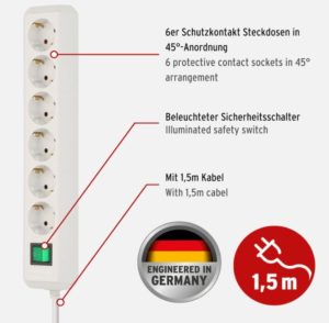 - Steckerleiste mit erhöhtem Berührungsschutz: Kunststoffplättchen verschließen die Kontakte der Steckdose