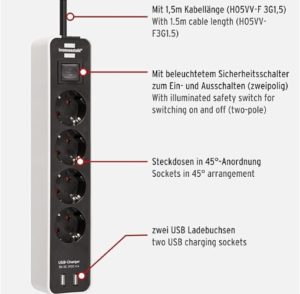 - 4er Schutzkontakt-Steckdosenleiste mit 1,5m Kabellänge (H05VV-F 3G1,5) und einer Steckdosenausrichtung von 45°