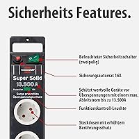 - Schützt wertvolle Geräte vor Überspannungen mit einem max. Ableitstrom bis zu 13.500 A (Schutz bei Gewitter, Blitzschlag, usw.)
