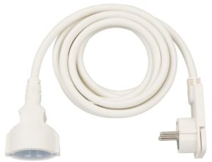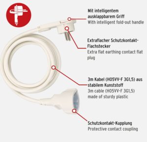 - Extraflacher Schutzkontakt-Winkelstecker und Schutzkontakt-Kupplung aus Kunststoff mit 3m Kabellänge H05VV-F 3G1,5 und erhöhtem Berührungsschutz