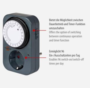 - Die Zeitschaltuhr bietet die Möglichkeit zwischen Dauerbetrieb und Timer-Funktion umzuschalten