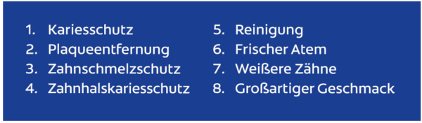 - Produktnutzen für Ihre tägliche Mundpflege: Kariesschutz, Plaqueentfernung, Zahnschmelzschutz und Zahnhalskariesschutz