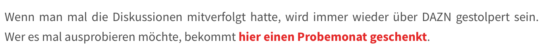 Wenn man mal die Diskussionen mitverfolgt hatte, wird immer wieder über DAZN gestolpert sein. Wer es mal ausprobieren möchte, bekommt hier einen Probemonat geschenkt.