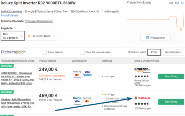 Denn bei eBay bekommt man die Deluxe Split Inverter R32 (9.000 BTU, 2.600 W) für 305,10€ (Vergleichspreis: ~349€) Ersparnis ~44€