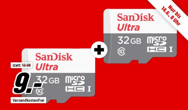 Bei MediaMarkt bekommt ihr heute als Preishammer den Doppelpack SANDISK Ultra microSDHC Speicherkarte 32 GB für 9€ (Vergleichspreis ~14€) Ersparnis ~5€