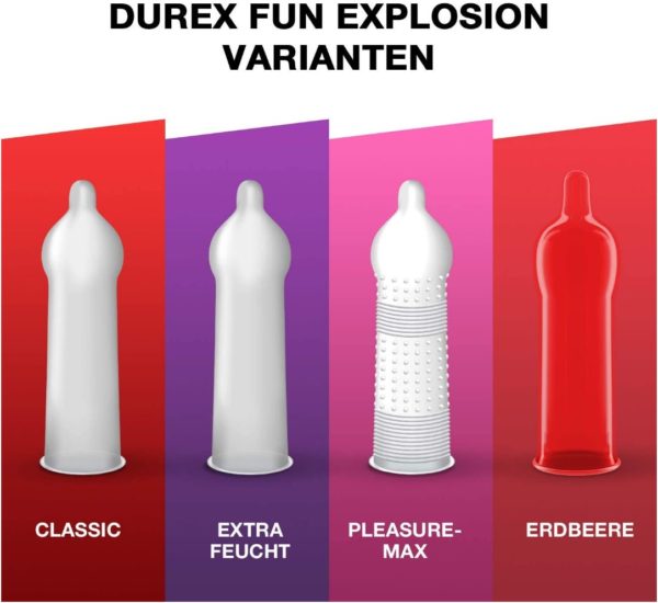 - Enthalten sind die Sorten Durex Gefühlsecht, Durex Gefühlsecht Extra Feucht, Durex Pleasuremax und Durex Erdbeer-Aroma – bei dieser Sortenvielfalt kommt garantiert keine Langeweile auf!