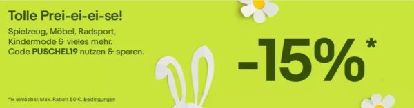 Bei eBay ist gerade eine neue Aktion gestartet bei der ihr 15% Osterrabatt auf Spielzeug, Mode, Radsport, Kindermode & Co. von teilnehmenden Händlern bekommt.