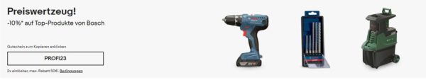 Bei ebay ist gerade eine neue Aktion gestartet bei der ihr 10% Rabatt auf Bosch-Artikel bekommt