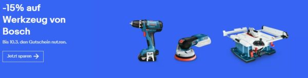 Bei ebay ist gerade eine neue Aktion gestartet bei der ihr 15% Rabatt auf ausgewählte Boschprodukte bekommt.