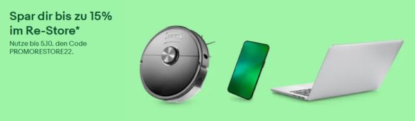 Bei ebay ist gerade eine neue Aktion gestartet bei der ihr bis zu 15% Rabatt für Artikel von ausgewählten Re-Store-Händlern bekommt