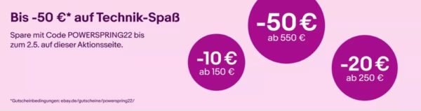Bei ebay ist gerade eine neue Aktion gestartet bei der ihr bis zu 50€ Rabatt auf ausgewählte Technik-Produkte bekommt.