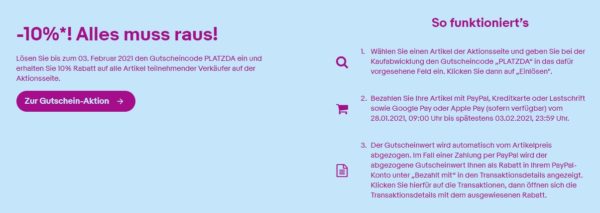 Auf den jeweiligen Preis kommt ihr immer mit dem Gutschein-Code PLATZDA, den ihr im Warenkorb angeben müsst. Gültig ist dieser übrigens einschließlich bis zum 03.02.2021.