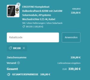 Ihr möchtet euch gerne ein Balkonkraftwerk zulegen 🌞, dann könnte das aktuelle Angebot von Ergofino genau das richtige sein, dort bekommt ihr das Ergofino 820W Balkonkraftwerk Komplettset mit 2x 410W Solarmodul & Wechselrichter für 339€ (Vergleichspreis ~439€) Ersparnis ~100€ 😮