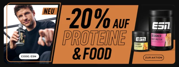 Im offiziellen Online-Shop von ESN erhaltet ihr bis einschließlich 8. Mai satte 20% Rabatt auf Proteine & Food! 🙂