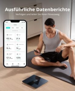 - Die Personenwaage ist kompatibel mit Apple Health, Google Fit oder Fit Bit, sodass Sie Ihre Fortschritte zusammen speichern und verfolgen können. Ideal für diejenigen, die bereits eine Fitness-App verwenden und ihre Daten nahtlos integrieren möchten.