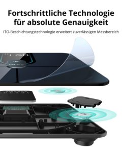 - PRÄZISE KÖRPERWAAGE: Die hochsensible ITO-Beschichtungstechnologie der Körperfettwaage ermöglicht es, auf jede beliebige Stelle der Waage zu treten, sodass die bioelektrische Impedanzanalyse (BIA) weiterhin aufschlussreiche Messwerte liefert. Hochpräzise Sensoren aus Manganstahl können geringfügige Gewichtsveränderungen mit einer Genauigkeit von bis zu 50 g (0,1 lbs) erkennen.